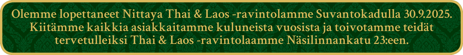 Tarjoamme suussa sulavia Thaimaan ja Laosin keittiöiden erikoisuuksia.Voit tutustua ruokalistaan näillä sivuilla, ja poiketa paikan päälle syömään lounaan seisovasta pöydästä tai nauttimaan herkullisista ruokalistamme annoksista. Voit myös soittaa ja tehdä tilauksen ja noutaa ruoat edulliseen Take Away -hintaan ravintolastamme.Voit myös tilata ruuan kotiisi Voltin tai Foodoran kautta.