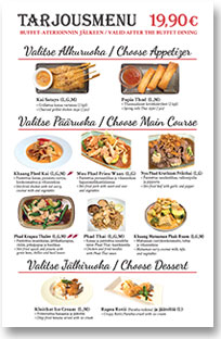 Tarjoamme suussa sulavia Thaimaan ja Laosin keittiöiden erikoisuuksia.Voit tutustua ruokalistaan näillä sivuilla, ja poiketa paikan päälle syömään lounaan seisovasta pöydästä tai nauttimaan herkullisista ruokalistamme annoksista. Voit myös soittaa ja tehdä tilauksen ja noutaa ruoat edulliseen Take Away -hintaan ravintolastamme.Voit myös tilata ruuan kotiisi Voltin tai Foodoran kautta.